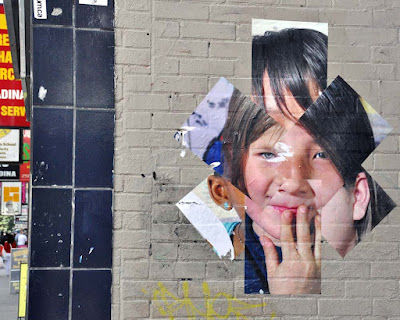 Graffiti tags and murals are all over the area, both along the main streets and also in the alleys behind the stores. The first time that I saw these starburst posters, below, was along Spadina and which use a collage of photos to make a face. I have since seen these at other locations along Dundas Street.